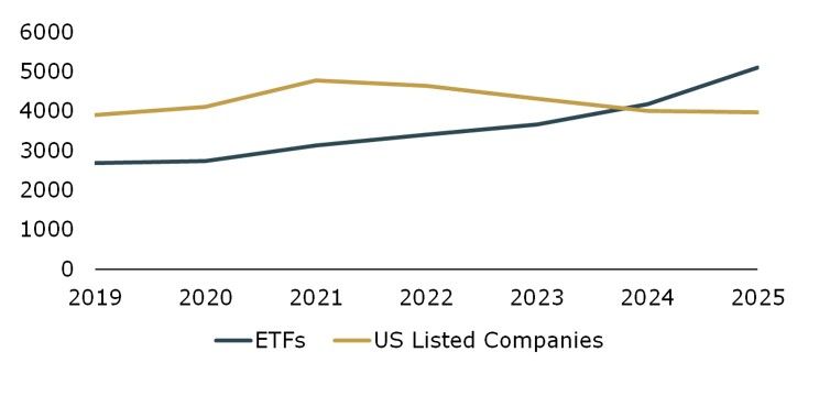 Source: Morningstar Direct as of 12/31/2025. Number of US Listed Companies for 2025 is estimated based on IPO and delisting data from StockAnalysis.com.