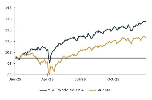 While the market’s momentum is backed by strong fundamentals of double-digit earnings growth for a second consecutive year, valuations have become stretched to levels not seen since the dot-com bubble. In addition, 2025 marked the year when international markets took leadership as the MSCI Emerging Markets index posted a 33% gain, highlighted by outstanding years in South Korea, Brazil, and Mexico. Developed markets excluding the United States also performed well, with the United Kingdom and Japan posting returns of 33% and 25%, respectively.