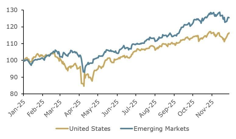 Past performance is not a reliable indicator of current or future results. Indexes are unmanaged and not subject to fees. It is not possible to invest directly in an index. United States returns are represented by the S&P 500 Index. Emerging market returns are reflected by the MSCI Emerging Markets Index. Source: Kestra Investment Management with data from FactSet. Performance data as of November 28th, 2025.