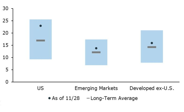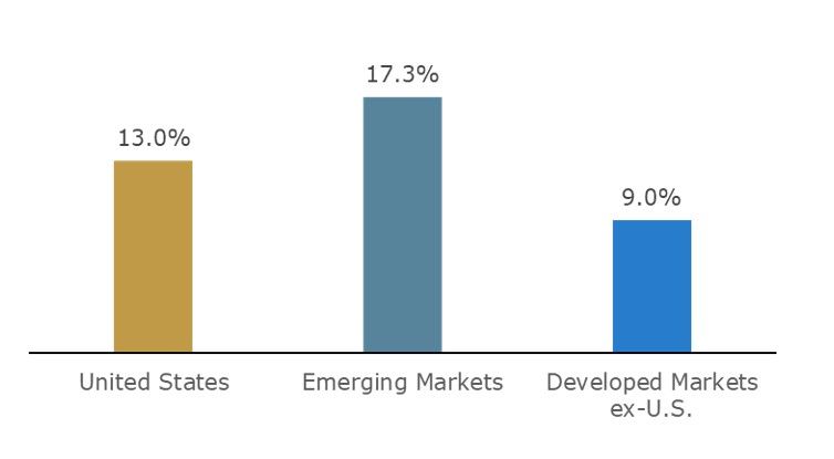 The U.S. economy and stock market have been resilient through a chaotic year, and Bloomberg’s forecast for earnings per share (EPS) growth in 2026 for the S&P 500 comes in at a healthy 13.0%. While that is a strong forecast outlook relative to developed market peers, it pales in comparison to the 17.3% expected earnings growth for the emerging market universe.